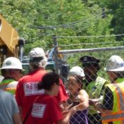 Finally, if the protesters ignore signage, fences or other barriers and trespass onto the construction site, employees or contractors should not try to physically stop them. Only law enforcement should take physical action. Workers may defend themselves, but not initiate any physical contact. Remember, the protesters may be trying to provoke a physical response for their cameras. Train your employees to immediately shut down all machinery, remove any keys, and stop all work. After the equipment is shut down and secured, workers should regroup at a pre-determined rally point on site and the supervisor should call for a law enforcement response. If the protesters begin throwing rocks, bottles, or take other violent action, all employees should immediately leave the work site and re-group at a pre-designated rally point away from the worksite. 911 should be called as soon as it safe to do so.